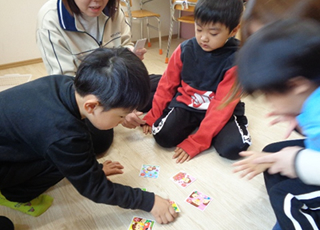 1月の2週目、お正月の遊びとして親しまれているカードゲーム、かるたをみんなで楽しみました。読み札の職員の顔をじっと見つめる子もいましたが、読まれた内容に合う絵札を探し、元気にカードを叩いて取っていました(^^) 今年も元気いっぱいに年明けスタートしたキララです☆
