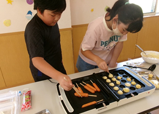 8月23日(土)中高生対象ののびっこクラブで夏祭りを行いました! フランクフルトやベビーカステラ、焼きそばをみんなで作りました♪また、看板もみんなで手作りしました!その後は、おうちの人を招待して夏祭りスタート!「ケチャップかけますか?」「ソース何にしますか?」と上手に聞いて、渡すことができていました!
