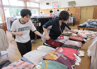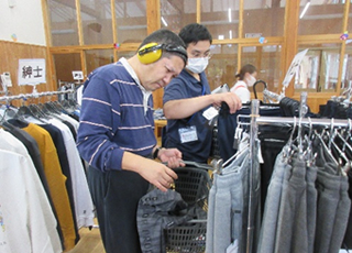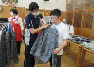 10月7日(火)に(株)マルトファミリー様の協力をいただき、衣類の訪問販売を実施しました。参加した利用者さんは長袖やトレーナー、長ズボンなどを買いました。自分の好みの色や柄の物を手に取ったり、衣類に触れて肌触りを確認したりしながら、お買い物を楽しんでいました。会計後、袋を持つ利用者さんは笑顔で満足した様子でした。