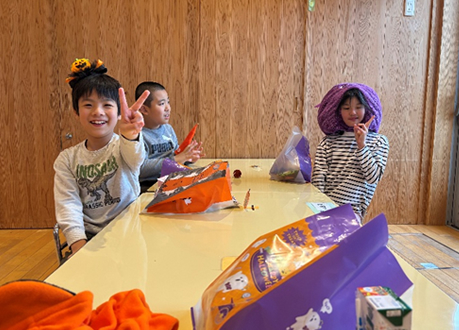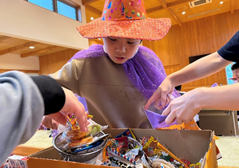 10月26日(日)にハロウィンパーティーがありました。みんなで好きな仮装を選んで、パーティースタート!1人1人、「トリックオアトリート!」と伝えてお菓子のすくい取りに挑戦です。好きなお菓子、お目当てのお菓子はゲットできたかな?今回はなんと、豪華なハロウィンケーキも登場し、みなさんおいしいものをたくさん食べて楽しいハロウィンパーティーを満喫しました(^^♪