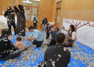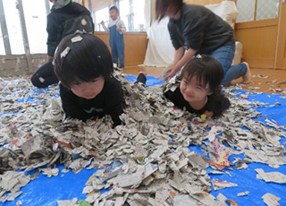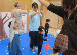 10月25日(土)、おやこ教室oru小田千尋先生(ちい先生)による、ぐちゃぐちゃ遊び教室を行いました。今回のテーマは、いつもの絵の具を使った活動ではなく、粘土と新聞紙。粘土をこねると白い粘土が紫色に大変身!小さく丸めて、秋の味覚ぶどうを作りました♪赤、オレンジ、黄色の折り紙は細かくちぎって美しい紅葉に!その後は、大量の新聞紙を使て新聞紙遊び♪みんなで上に投げて、紅葉が舞う様子を表現したり、身体の上からかけて、お布団やドレスのようにしたりと、親子で笑顔いっぱいのふれあい遊びを楽しむことが出来ました(*^^*)