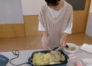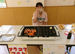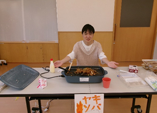 8月23日(土)中高生対象ののびっこクラブで夏祭りを行いました! フランクフルトやベビーカステラ、焼きそばをみんなで作りました♪また、看板もみんなで手作りしました!その後は、おうちの人を招待して夏祭りスタート!「ケチャップかけますか?」「ソース何にしますか?」と上手に聞いて、渡すことができていました!