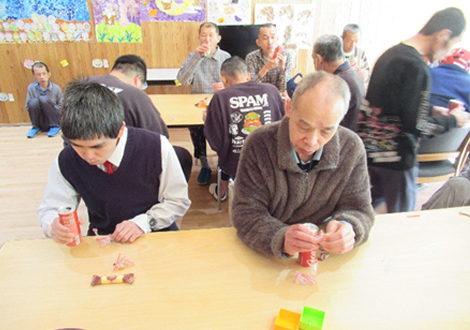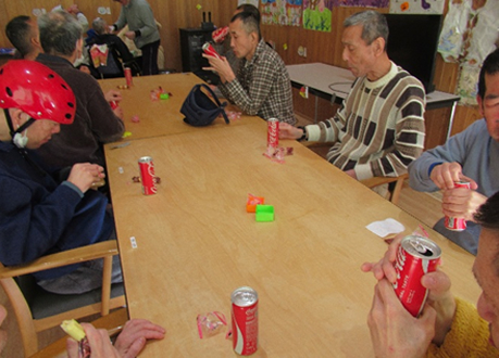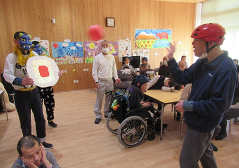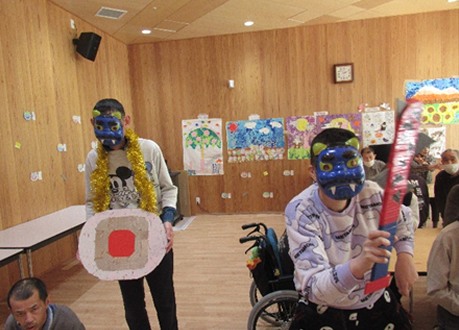2月3日(火)に節分行事を行いました。鬼役をかって出てくれた2名の利用者さんのパフォーマンスは鬼気に迫る迫力で、皆さん、自分の中の鬼を退治しようと豆に見立てたボールを思い切り的に当て追い払いました。鬼が去った後は、たくさんの福を招き入れようと恵方(今年は南南東です!)を向いて、恵方巻ならぬバームロールを食しましたが、黙々と…とはいかなかったようで、和気あいあいとおしゃべりをしながら節分行事を楽しみました。