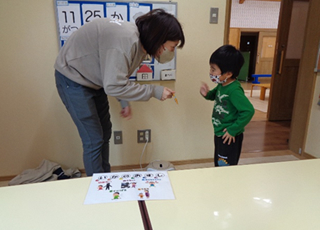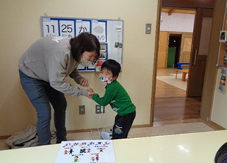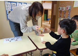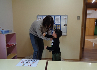 11月の第5週目、防犯標語「いかのおすし」を用いて不審者への対応方法を学びました。 「お菓子あげるから遊ぼう」と声を掛けられて、知っている職員なので貰おうとしていたお子さんもいましたが、ほとんどのお子さんは「いらないです」と断り、大きな声で「助けてー!」と言って逃げていました。腕を振り払って逃げる練習、声掛けされた時の状況説明など、一生懸命取り組んでいました。