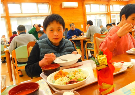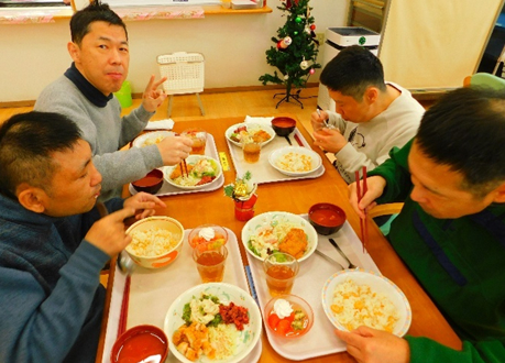 12月25日(木)に待ちに待ったクリスマス会を行いました。お昼ご飯にはベストフードさん協力のもと、クリスマス特別メニューが振舞われました。クリスマスにちなんだメニューが用意されており、皆さん笑顔で美味しそうに食べる様子がみられました。午後からは、サンタさんとトナカイさんが歌いながら登場?サンタさんからプレゼントをもらい大喜び。レクリエーションを楽しんだ後に、みんな一緒にシャンメリーで乾杯!